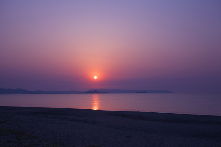 このときはまだ、朝日だけを撮るつもりであった。駐車場から海は見えないが、高さ2,3mほどの小さな砂丘を迂回すると今度は誰もいない浜にぽんと出た。
