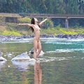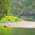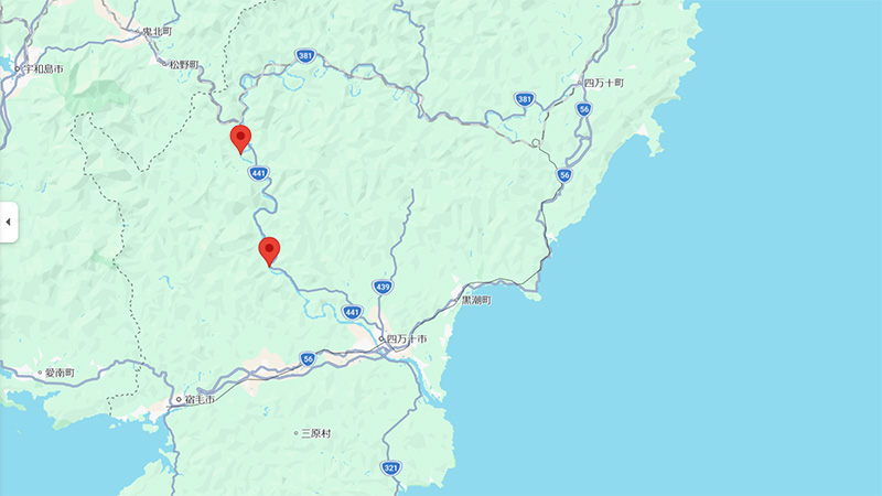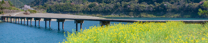 前半は有名観光地ですが車が通るときは菜の花の中にしゃがんで隠れることができます。ところが後半は江川崎付近の両岸の道路から見下ろせる開けた河原で、身を隠す場所のないロケ地でした。詳しくはESSAYをご覧ください。→撮影事故記録7/四万十川沈下橋事件